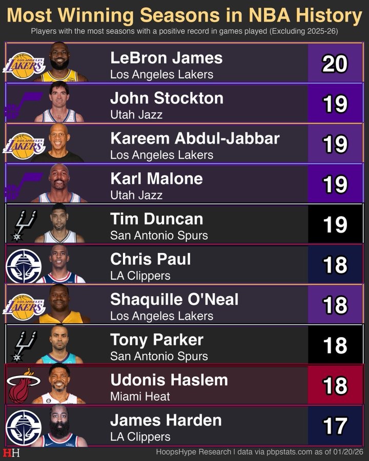 20次 —— 詹姆斯19次 —— 斯托克顿、马龙、贾巴尔、邓肯18次 —— 保罗、奥尼尔、托尼·帕克、哈斯勒姆17次 —— 哈登注:25-26赛季不算在内...